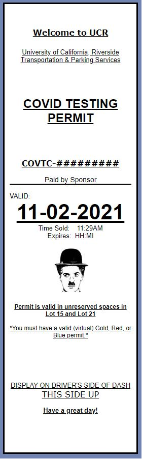 • COVID Testing Permit available at the University Kiosk on West Campus Drive near Parking Lot 1.