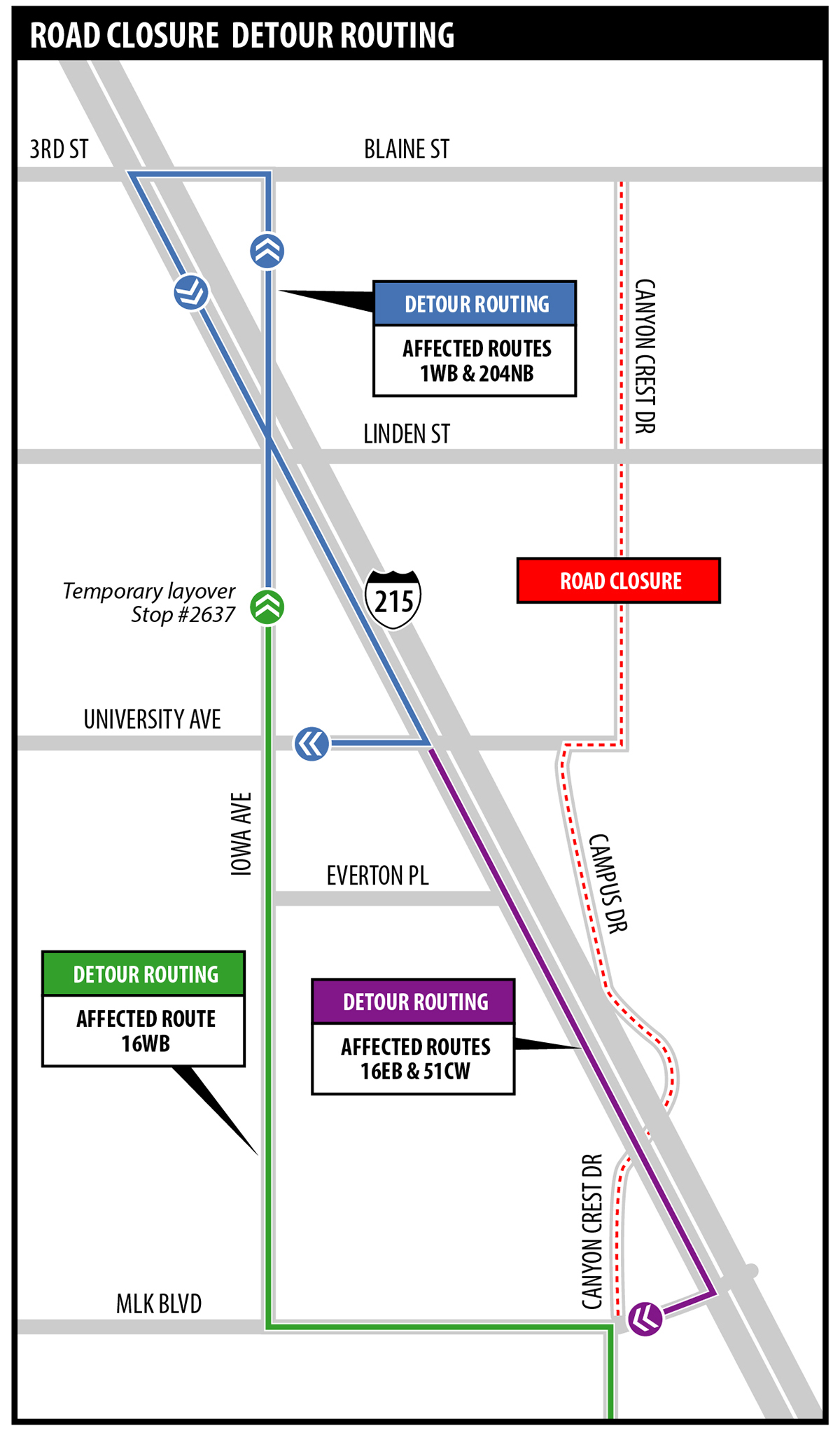 As of Nov. 15, the UCR at Bannockburn bus stop along with other stops on Campus Drive and Canyon Crest Drive will not be served. A temporary layover zone and transfer point for Routes 1, 16, 51 and 204 has been established on Iowa Avenue at a bus stop between University Avenue and Linden Street. It is unknown when regular routing will return.