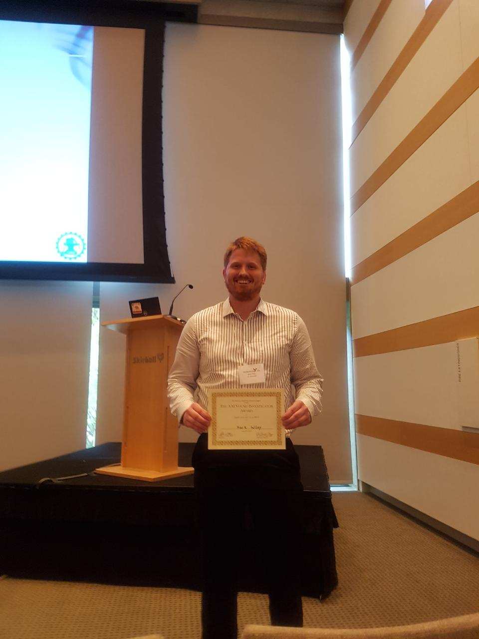 Mark Wiley, a doctoral student in biomedical sciences working with faculty members Nicholas DiPatrizio and Meera Nair, received the American Associations of Immunologists Young Investigator Award for best oral presentation on June 28 at Immunology LA 2019, hosted by Cedars-Sinai Medical Center.