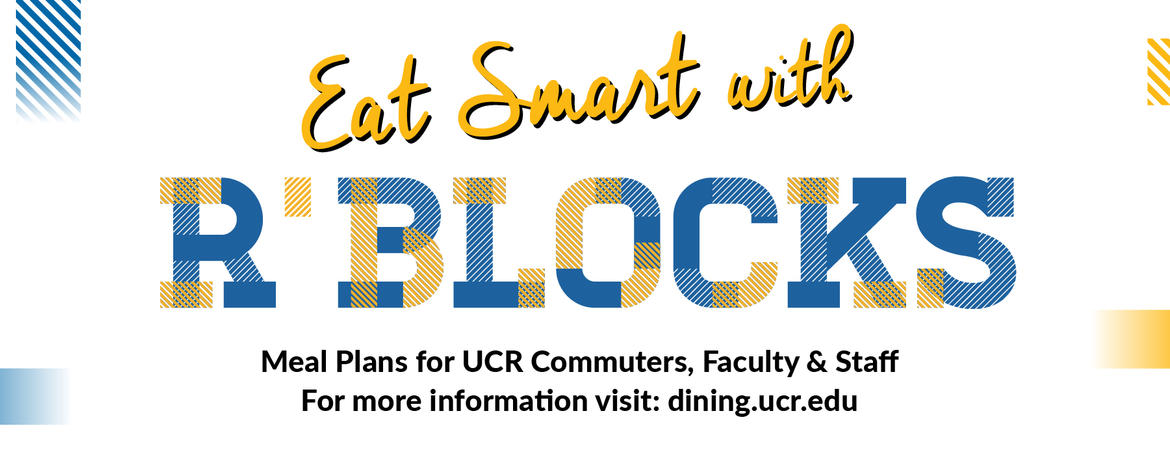 Eat Smart with R'Blocks! R’Blocks -- 50, 30 or 20 meal block plans -- are intended for UCR staff, faculty and commuter students who love the convenience of eating on campus and appreciate great value.
