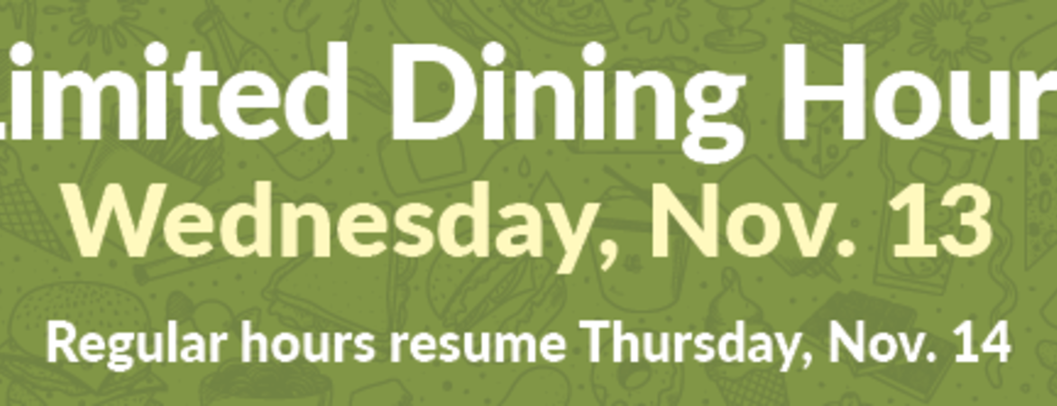 Due to a staffing shortage, UCR Dining will operate a modified schedule on Wednesday, November 13. Regular hours of operation resume Thursday, November 14. Please visit dining.ucr.edu for the most up-to-date Dining hours.