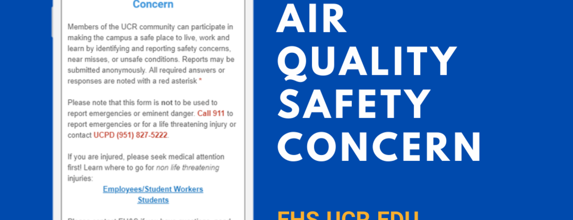 If you have a concern or would like to report an Indoor Air Quality concerns to EH&S using the “Report a Safety Concern” link at ehs.ucr.edu or please call (951) 827-5528 or email ehsih@ucr.edu.