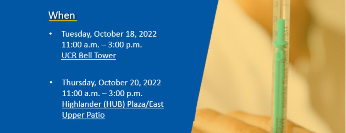 - Tuesday, October 18, 2022 | 11:00 a.m. – 3:00 p.m. | UCR Campus Bell Tower