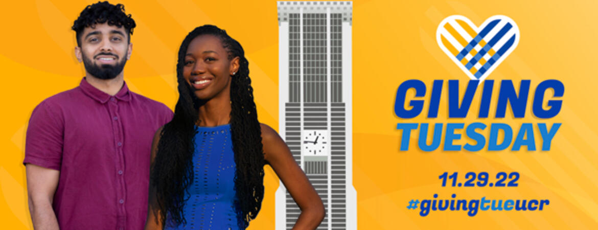The Office of Annual Giving is excited to partner with you once again this Giving Tuesday — beginning now through November 29, 2022! Giving Tuesday gives us a wonderful opportunity to build on the success of past years and enliven both passion and enthusiasm for supporting UCR’s students, research initiatives, and other top priorities. This year giving back to UCR can happen in a number of ways—making a gift, recruiting champions, and serving as a champion yourself. Learn more about Giving Tuesday or make your gift early by #GivingTueUCR at dayofgiving.ucr.edu!