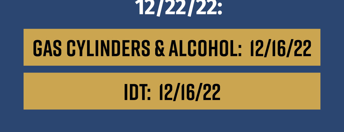 UC Riverside Receiving Services has announced the order by dates to receive Gas Cylinders and Alcohol, and IDT on or before December 22nd before the Holiday Break.