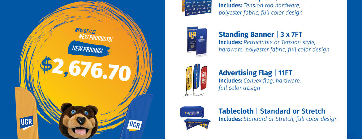 UCR’s own Auxiliary Design Services knows UCR’s brand intimately and will design a package that will make your own unique departmental style stand out while maintaining the integrity of the UCR brand.
