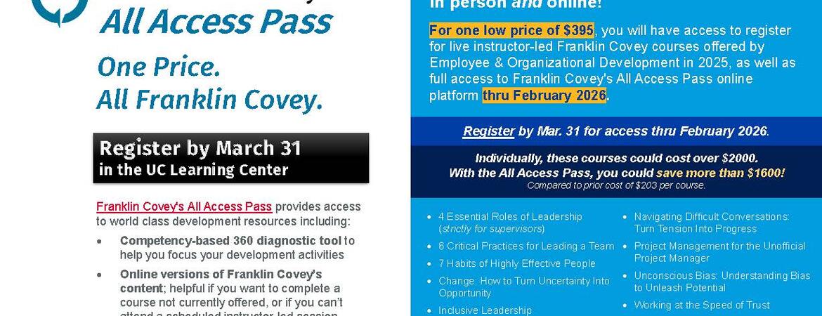 Employee and Organizational Development (EOD) encourages all UCR staff to take advantage of Franklin Covey’s All Access Pass because it provides a unique opportunity to develop both personally and professionally. This pass grants access to high-quality leadership and skill-building courses designed to enhance effectiveness, build trust, and create meaningful impact in the workplace.