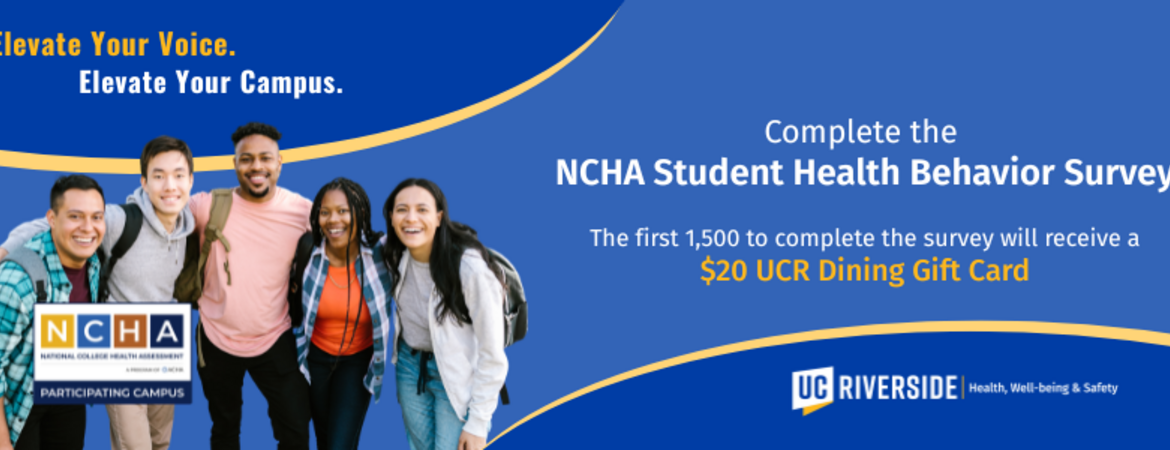 All UCR students are invited to participate in the UC Riverside Student Health Behavior Survey, part of the National College Health Assessment (NCHA) conducted by the American College Health Association (ACHA). This survey helps us better understand student health behaviors and improve wellness programs and services at UCR.