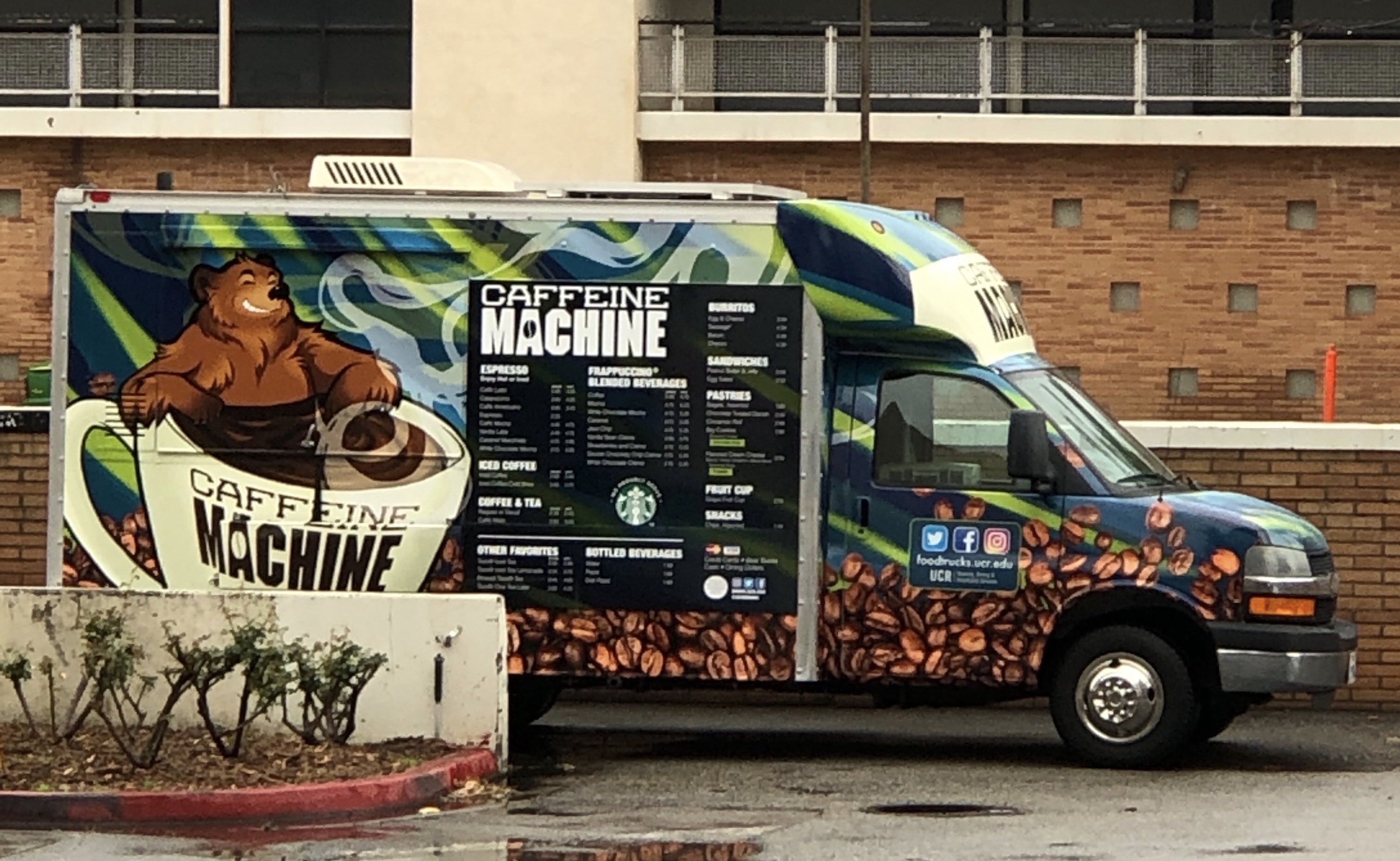 If you and your sweetie are looking for coffee on the go, stop by Caffeine Machine. The new coffee truck offers hot or iced coffees, teas, and espressos as well as Frappuccino blended beverages. The creative Caffeine Machine wrap design was illustrated by UCR student and contest winner Hannah Way. Visit the Physics 2000 courtyard Monday thru Friday, 8 a.m. to 2 p.m. throughout the quarter to enjoy Caffeine Machine.