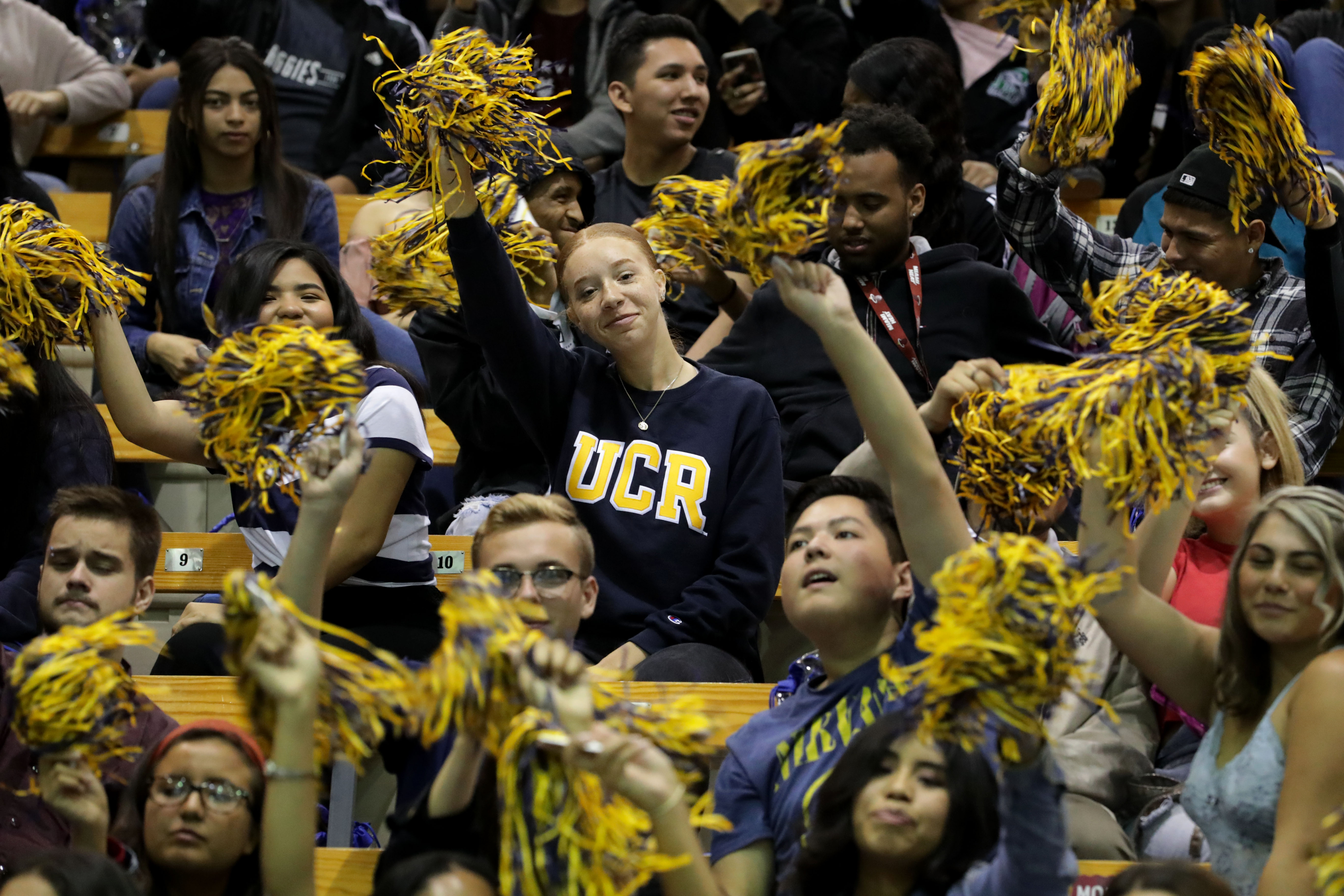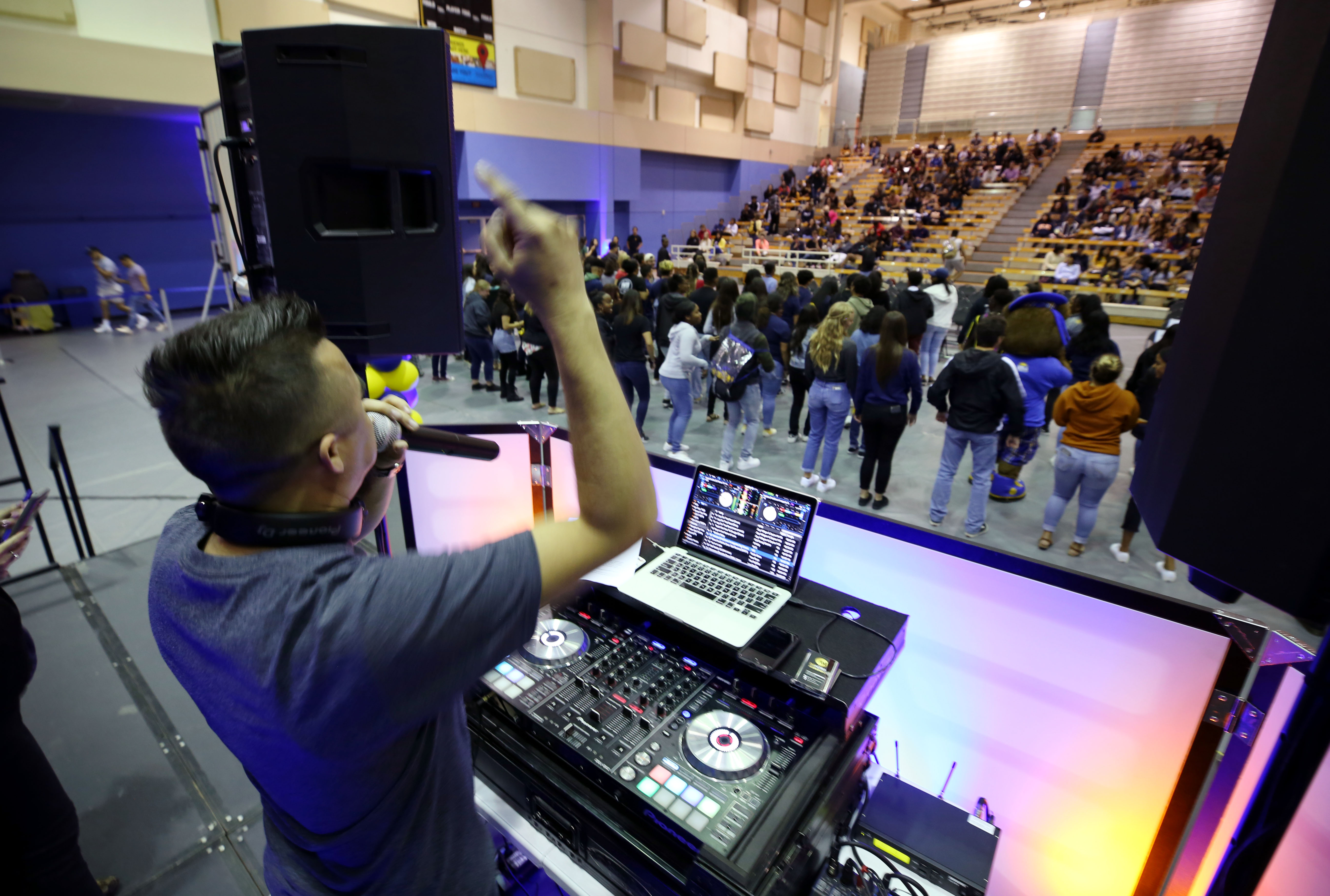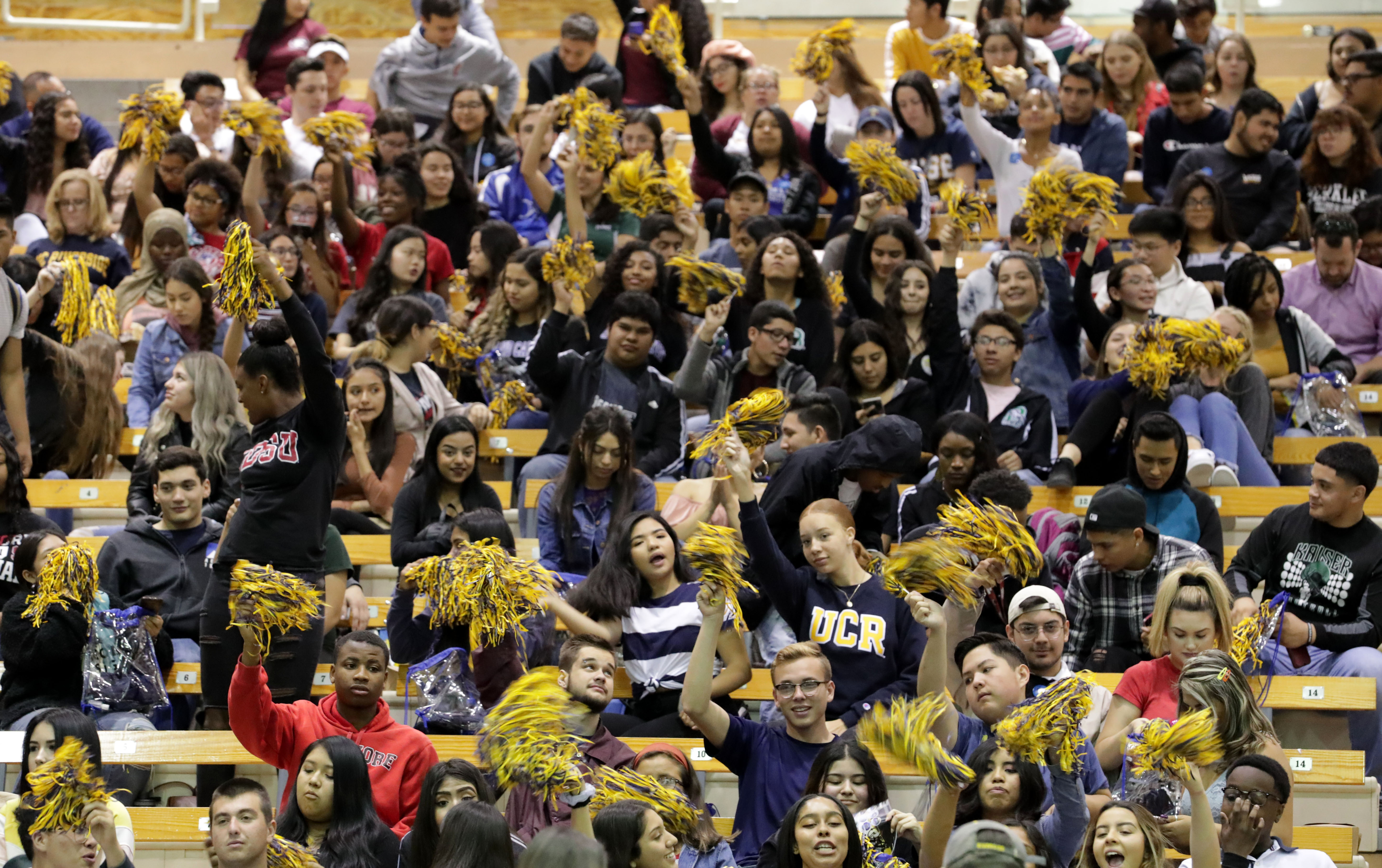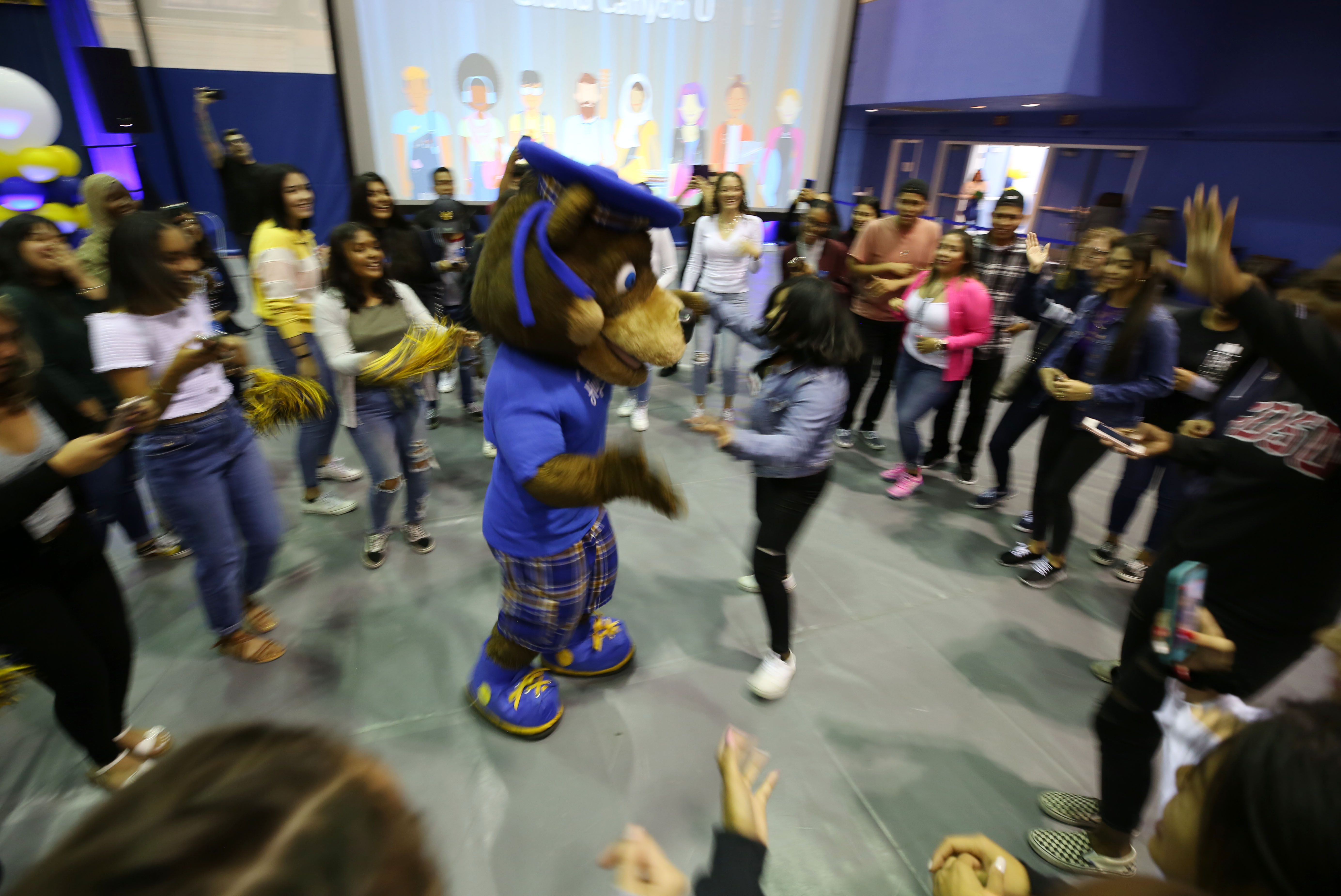 The students, who came from more than a dozen school districts in Riverside and San Bernardino counties, were greeted with boxed lunches and bags of swag that included pom-poms, a T-shirt, and hand sanitizer. They posed for photos in front of a backdrop of blue and gold balloons with some taking selfies with Scotty the Bear. As a DJ played music, several took to the dancefloor with Scotty joining them for some songs.