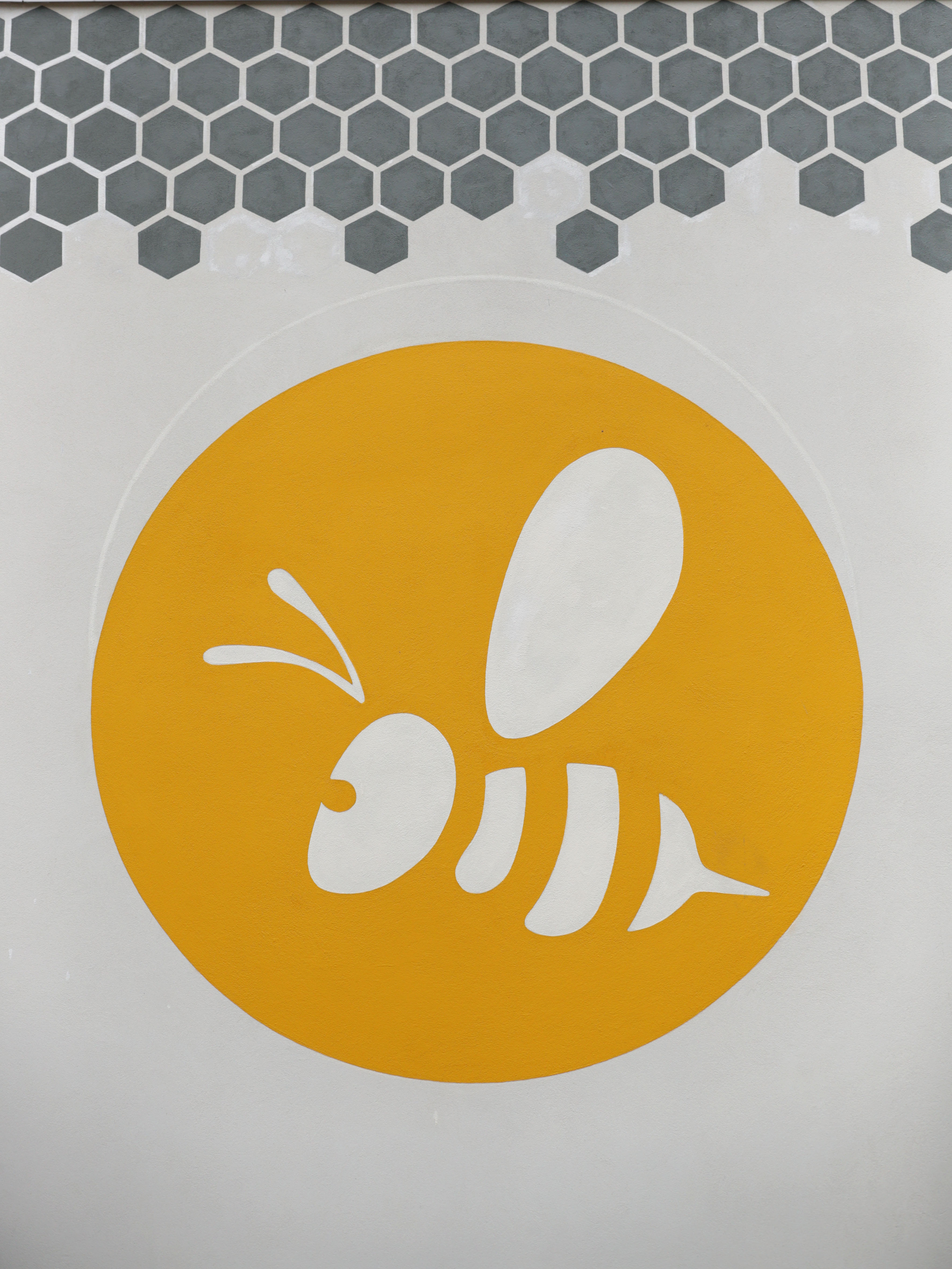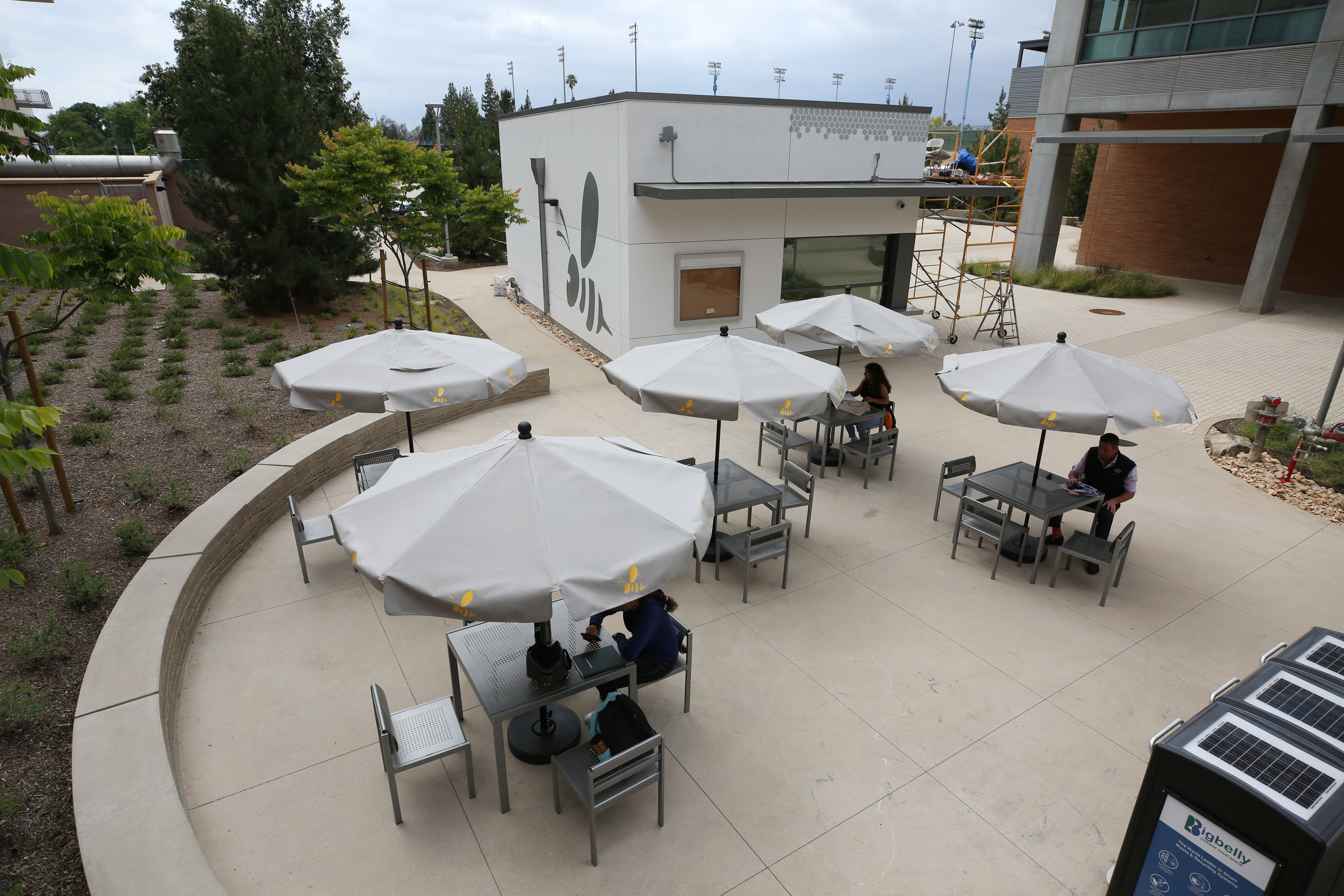 The bee motif is part of the look of the café which features honeycomb patterns, a yellow-and-black color scheme, and a yellow bee logo on the side of the building and on top of the umbrellas over the tables.