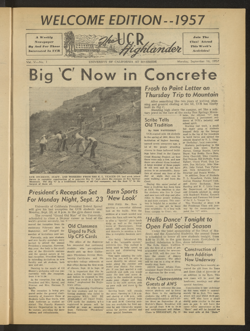 Some topics remain constant. A Sept. 16, 1957 front page headline announced “Big ‘C’ Now in Concrete,” describing a trip by freshmen to paint the “C” on Box Springs Mountain.