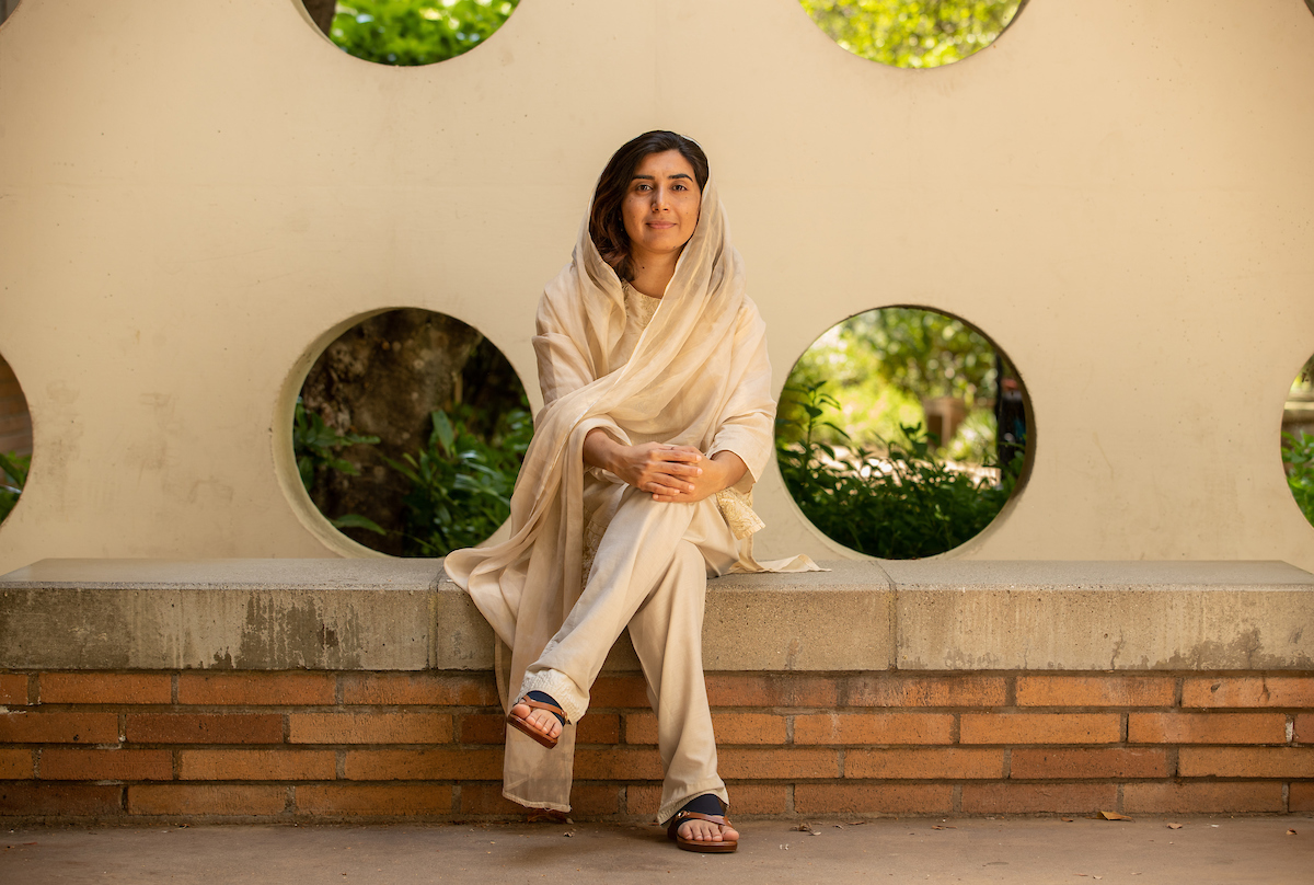 Seated in front of UC Riverside’s signature UCR sign at the HUB Plaza, doctoral student Amena Sadat was dressed in a cream-colored and gold embroidered shalwar kameez on a sunny spring afternoon.