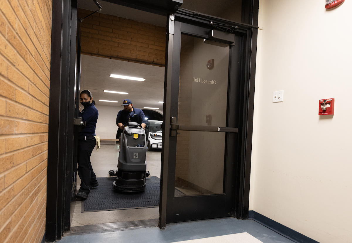 On a late October night, the crew was working in Olmsted Hall, cleaning the floors.