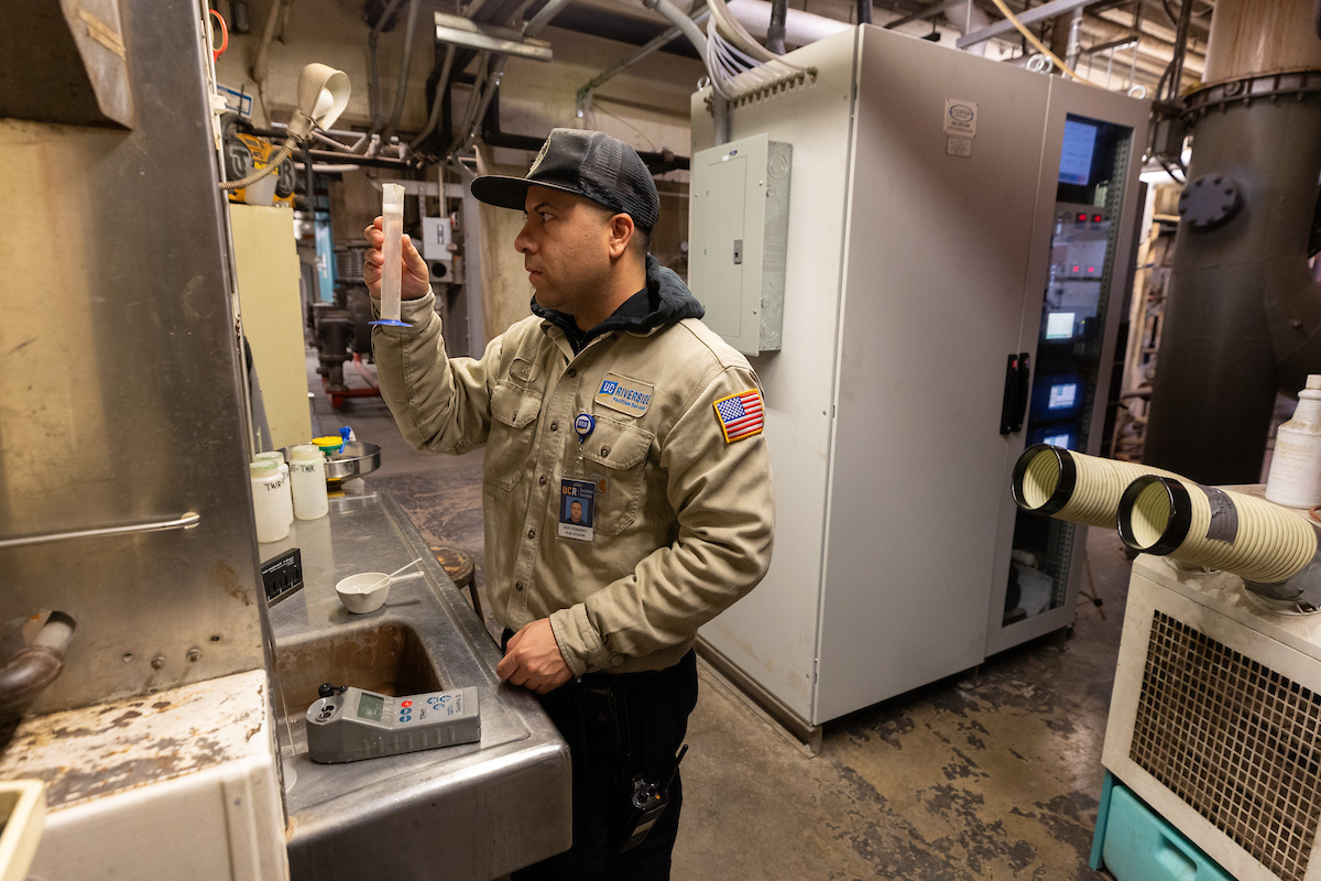 Plant operators Ricardo Rodriguez and Rudy Hernandez, who work the night shift, monitor readings from the plant control room. During their shift, they take readings, start up chillers, and remotely open valves.
