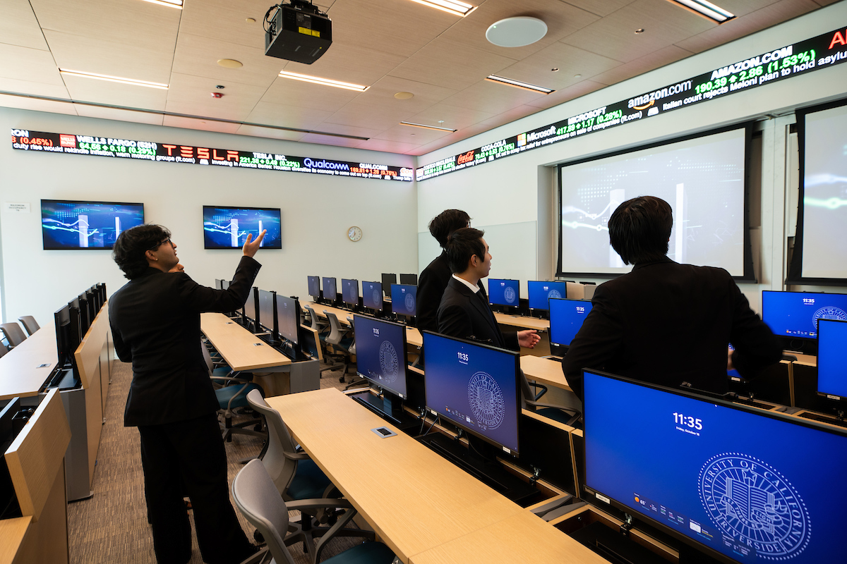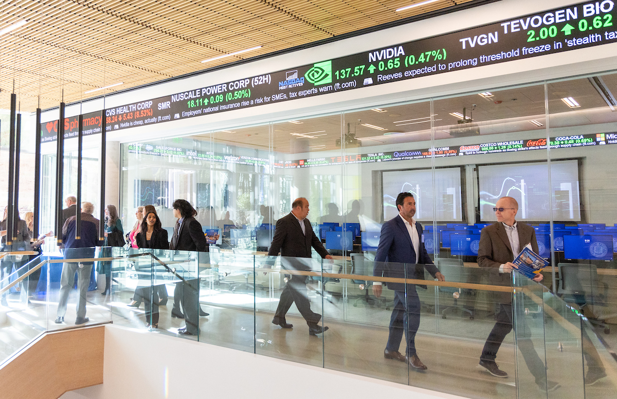 The new building includes a 350-seat auditorium, two 80-seat classrooms, a computer and finance lab with a stock market ticker LED display, study spaces spread throughout the building, and a graduate student lounge.