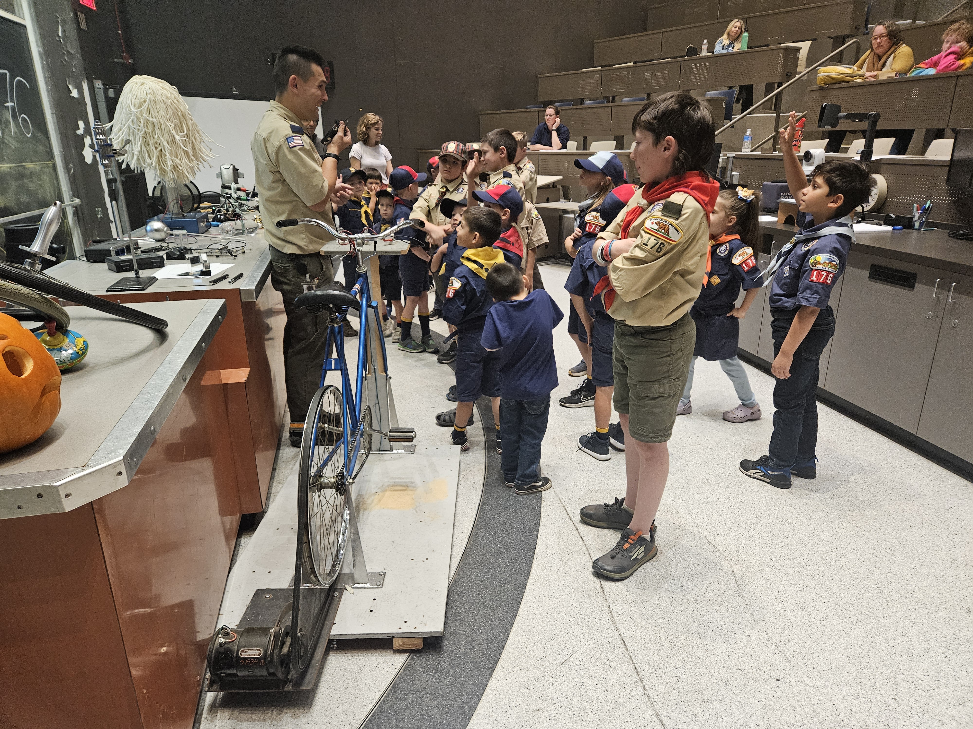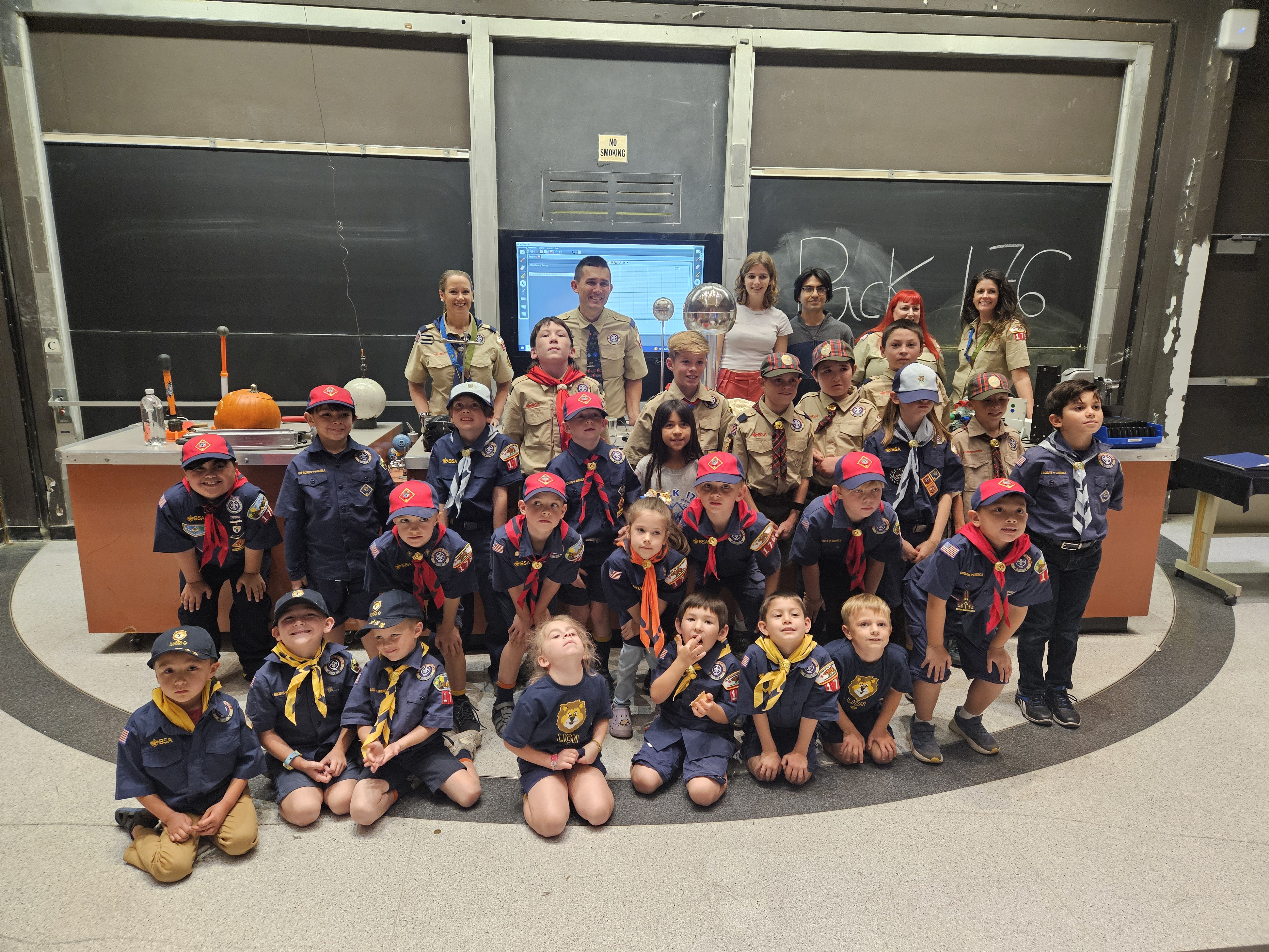 “We had almost 30 scouts in attendance, and the kids and their parents all were smiling from beginning to end,” Sanderson said. “We covered quite a few topics, from electricity generation to motion and forces. Some favorite demos were our CO2-powered car, bicycle wheel gyroscopes, a Van de Graaff Generator, and a solar telescope.”