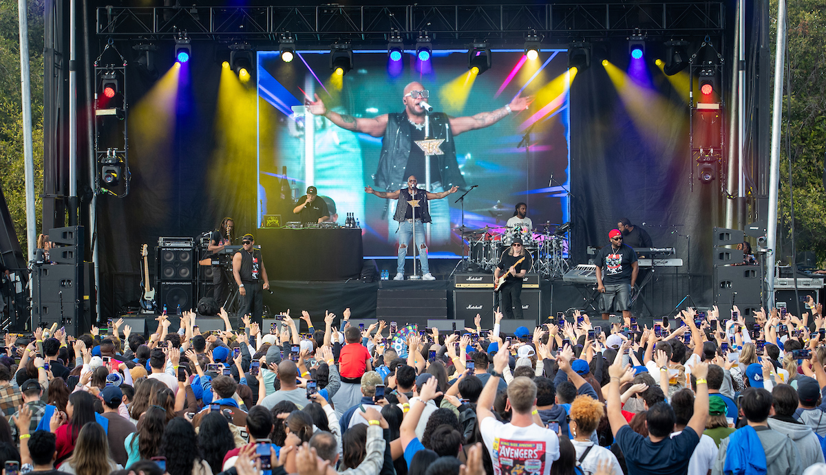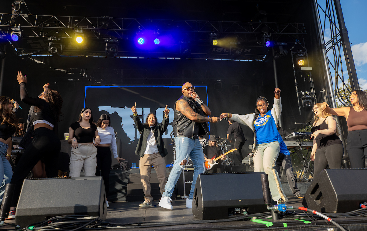 Performing before a packed crowd on Saturday, Nov. 2, Flo Rida encouraged Highlanders to get “Low” and spread “Good Feelings” with an energetic set that included those and other signatures hits. Wearing a UCR jersey at one point, Flo Rida invited fans to the stage to sing and dance with him and went down onto the lawn for part of the performance. He sprayed champagne and passed out roses and his autographed Nikes to fans.