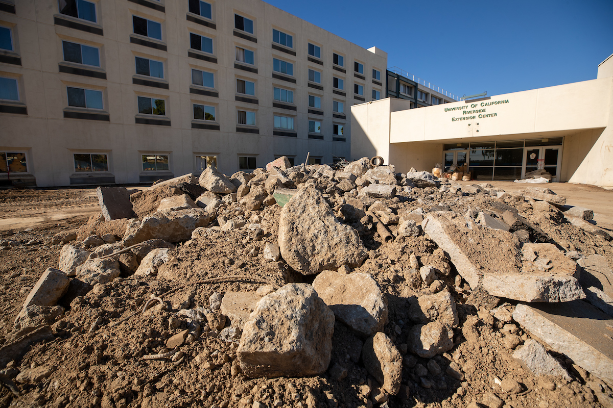 Demolition began in November of the former UCR Extension Center on University Avenue, with the parking garage torn down over the course of a month.