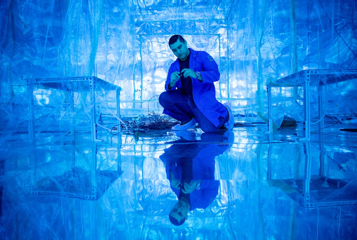 Part of my job is to take photos for marketing materials like brochures, websites, socials, etc. I had seen photos of CE-CERT’S atmospheric chamber before, and after six years of working at UCR, I finally got a chance to do a photo shoot inside it. When I saw the reflective floor, I knew I had to get a shot of a subject mirrored in it. The blue hue coming from the lights in the chamber was a bonus.