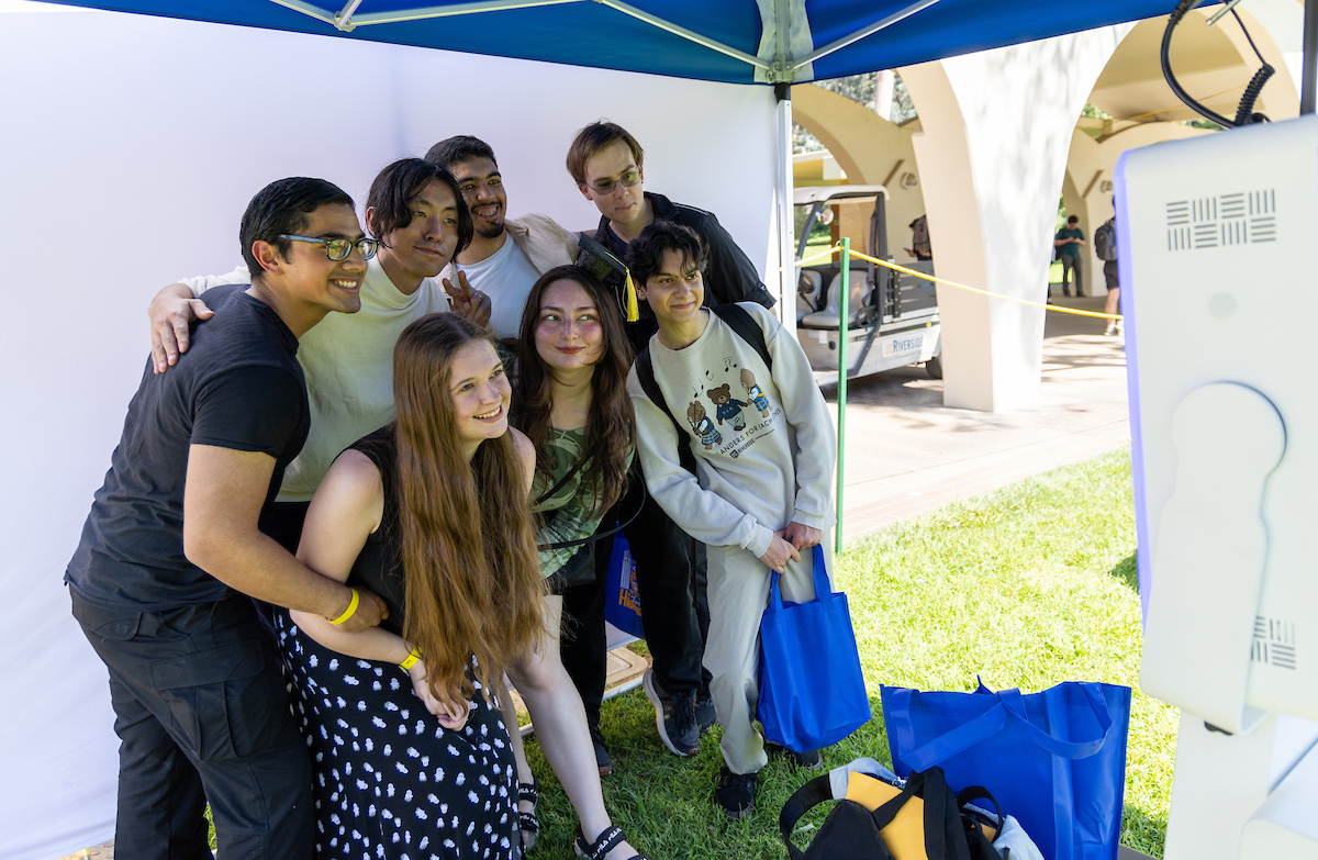 The event included a deejay playing music, a photo booth, graduation cap decoration, games, treats, and swag. A group Class of 2025 photo was taken in front of the UCR sign at the HUB.