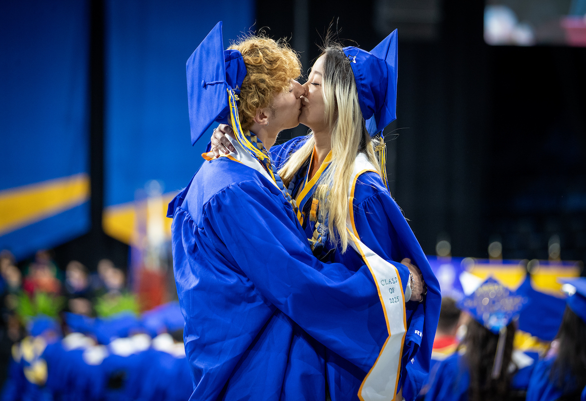 The Highlander Class of 2025 debuted blue caps and gowns, a change from the traditional black regalia worn by previous graduates.