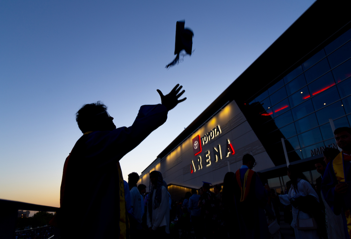 Ceremonies began with a video compilation of student experiences, a graduate procession to “Pomp and Circumstance,” a faculty and staff procession led by UCR’s Pipe Band, the Star-Spangled Banner, and a Native American land acknowledgment. Next were intros by deans, a welcome from Chancellor Kim Wilcox, words from elected student speakers, industry keynotes, the reading of graduate names, the singing of UCR’s Alma Mater, “Hail Fair UCR,” tassel turning, and, finally, a recession. Scotty the Bear also made appearances and mingled with the guests in the stands.