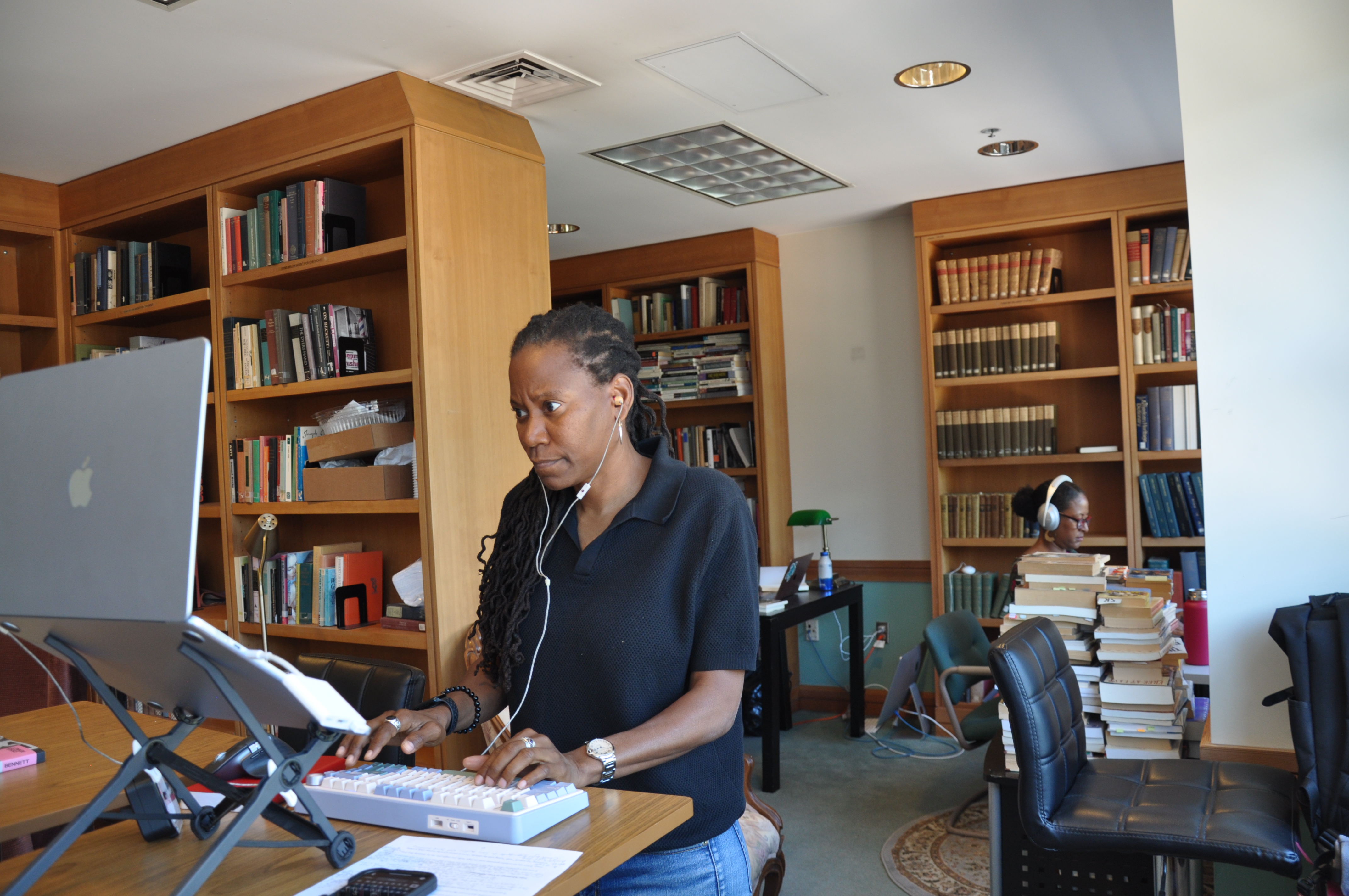 The location was just as important for Cherry in setting a mood. The group met at the English department library at the Humanities Building, which has large windows that provide plenty of sunlight, wooden bookcases filled with old bound volumes, and seating at a large table, leather lounge chairs, and corner nooks. The workshop supplied participants with breakfast, lunch, and coffee.