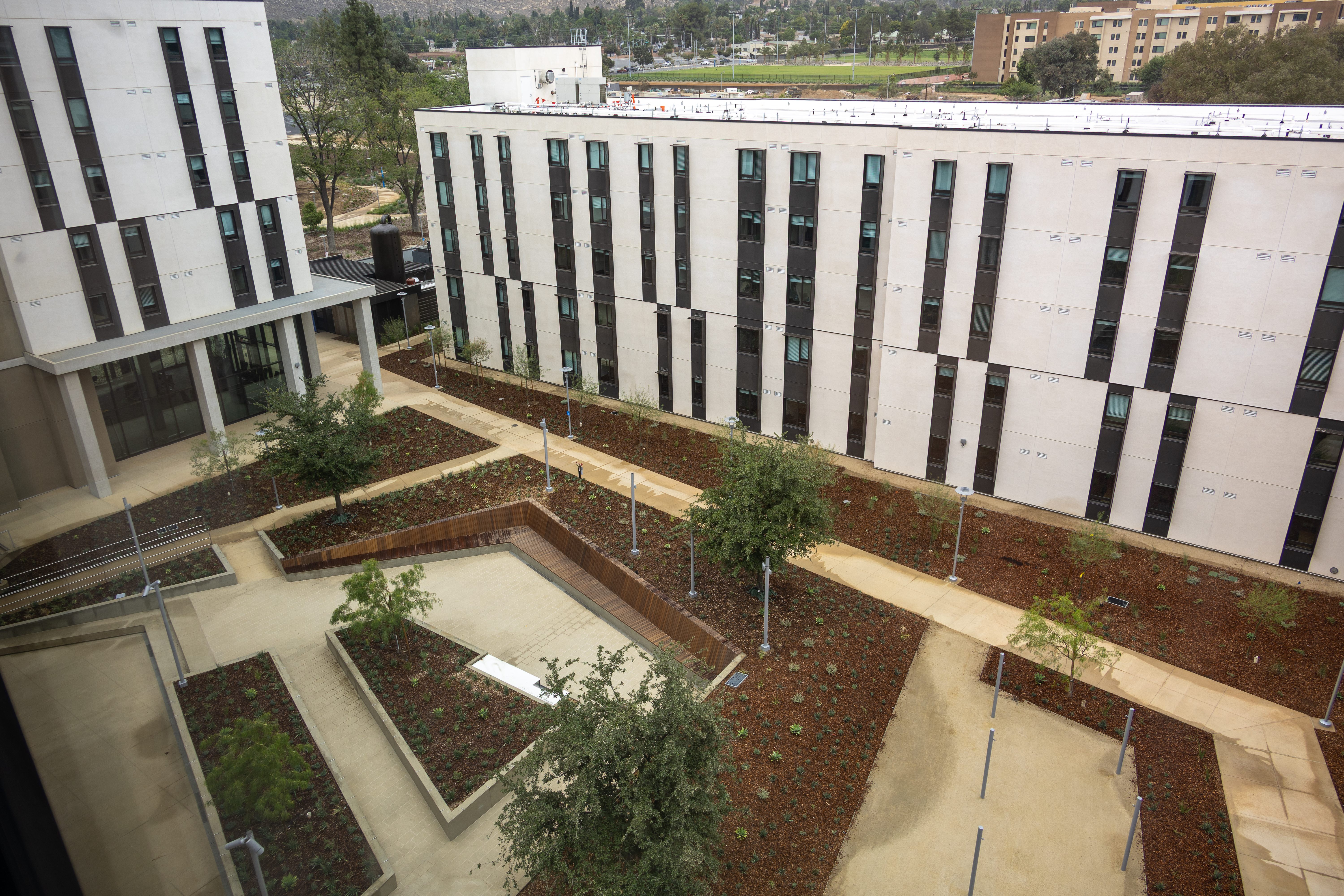 The 415,000-square-foot complex features 429 furnished units with 1,568 beds in two apartment-style buildings with amenities that include a gym, laundry facilities, two large courtyards with games and benches, and a central park with a trail. North District 2 has 652 beds at below-market rents, splitting them between UCR students and RCCD students.