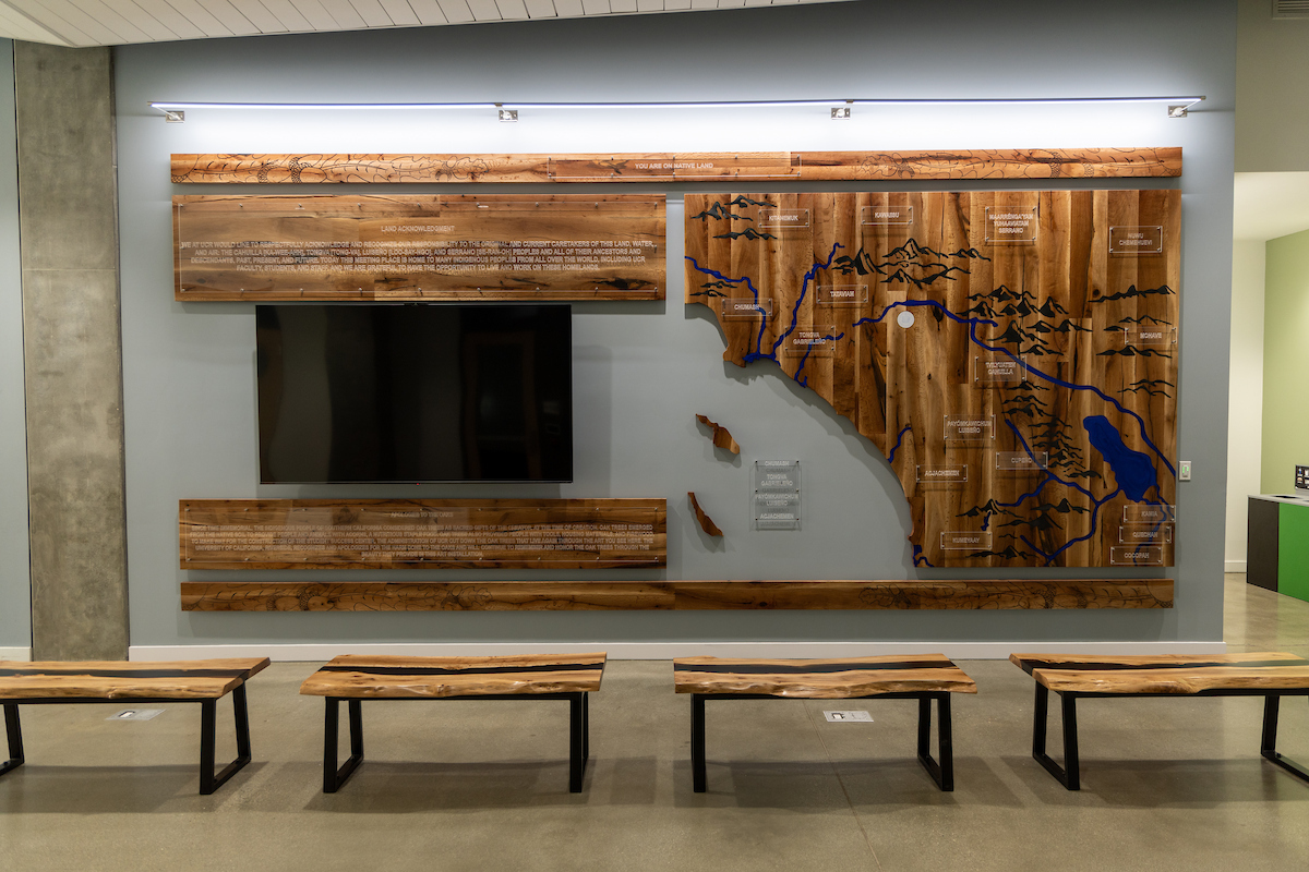 A top panel of the display features UCR’s Native American Land Acknowledgement, in which the campus recognizes its responsibility to the Cahuilla, Tongva, Luiseño, and Serrano peoples as the original and current caretakers of the land, water, and air.