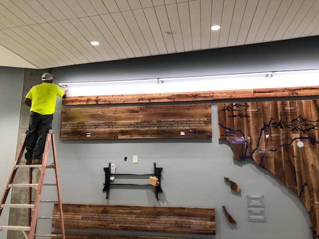 The installation, mounted on a wall on the building’s first floor, combines several wood pieces to create a 20-foot-wide and 10-foot-long display.