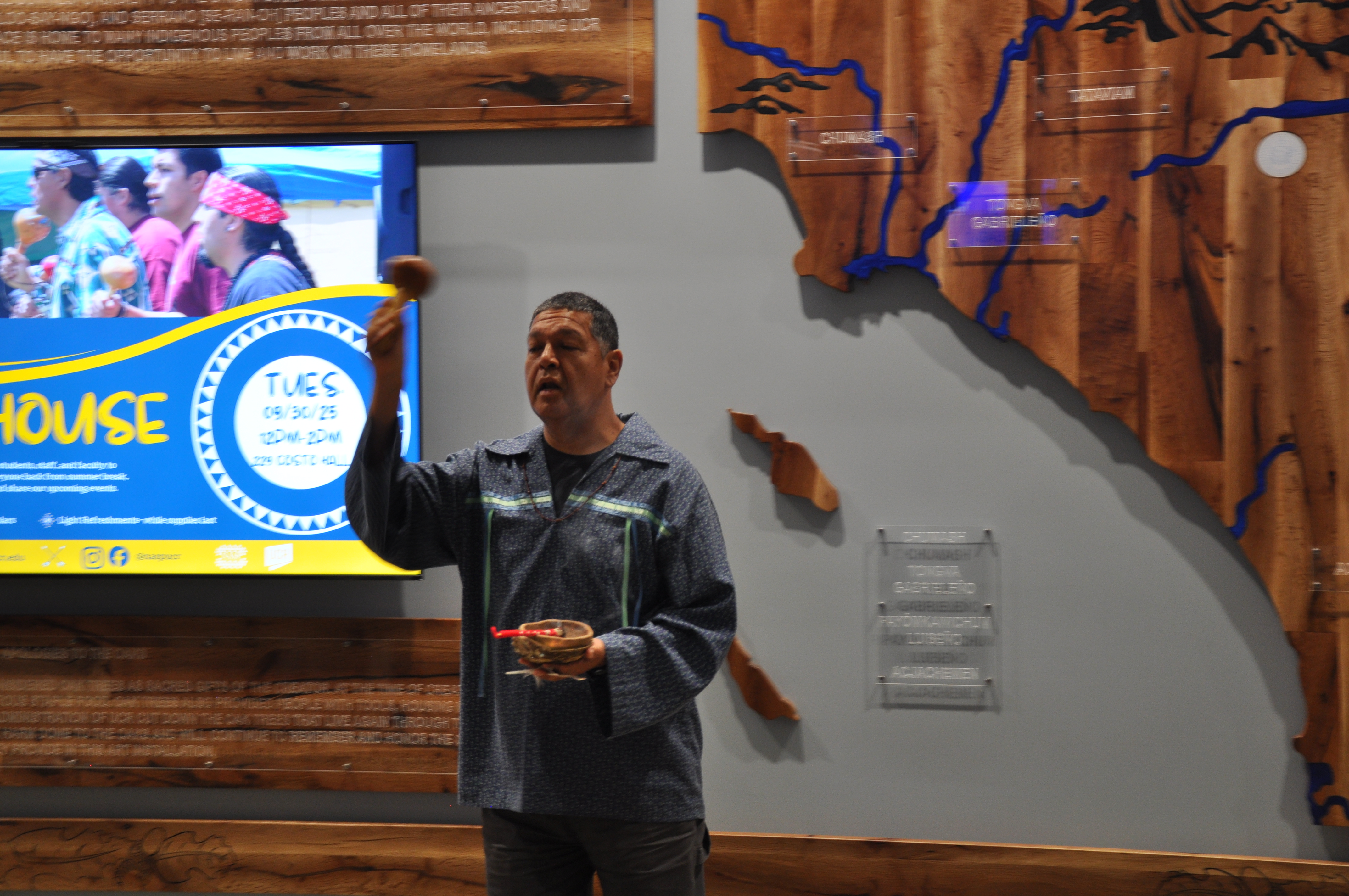 Native American Student Programs, or NASP, worked with campus leaders and groups to come up with the idea of honoring the trees with a map showcasing the region’s Indigenous history. The display also includes a TV monitor to display photos, videos, announcements, and stories about Native American events and figures.