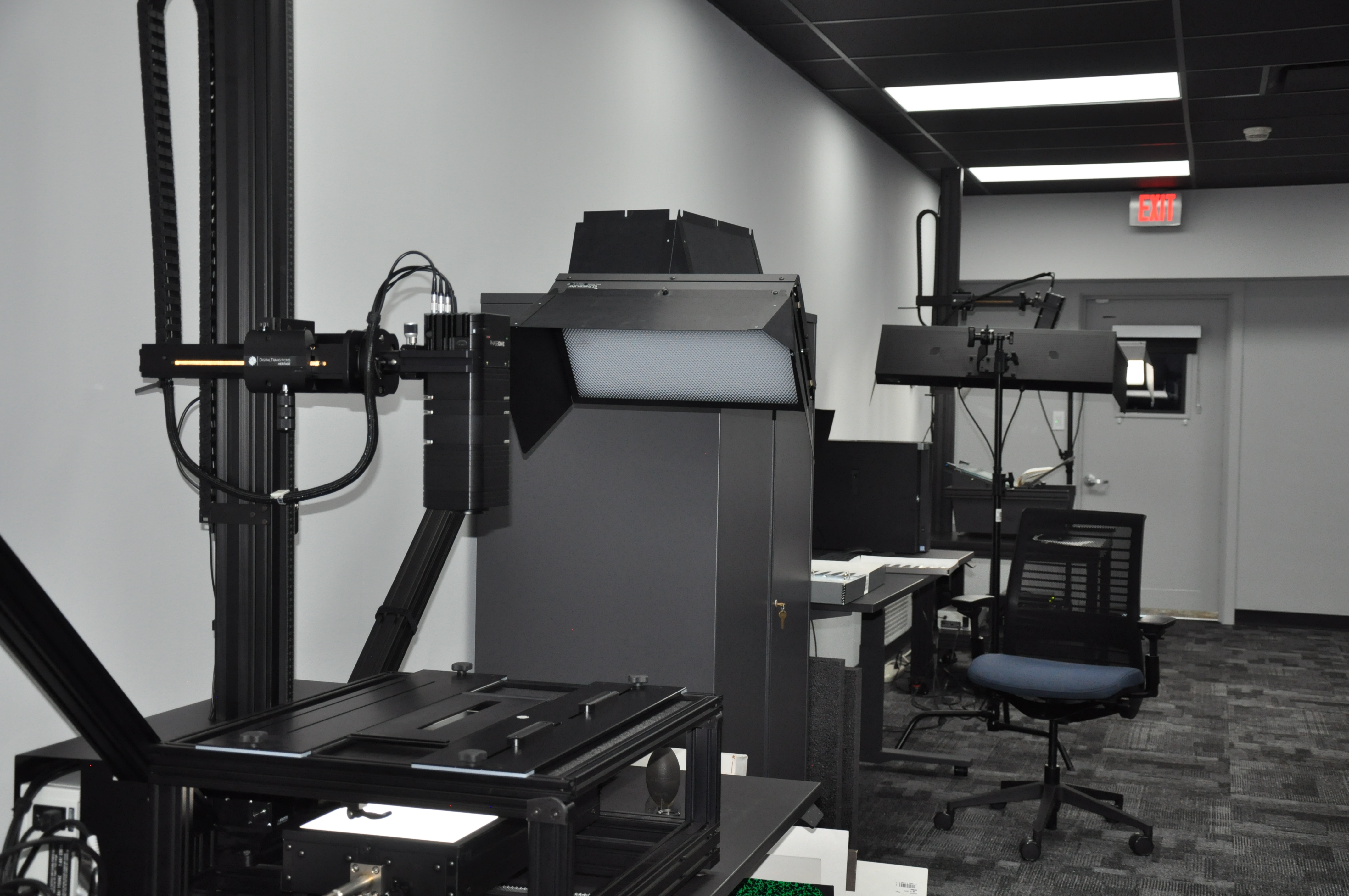The new lab, which was renovated with spectrally neutral paint and dark carpeting and furniture, is designed for its needs with grey and black colors that minimize color reflection and blackout curtains to create a controlled environment. The overhead lighting uses specialized dimmable LEDs to achieve a high Color Rendering Index (CRI > 90) and a 6500K color temperature to optimize both capture and quality assurance of preservation-grade images.